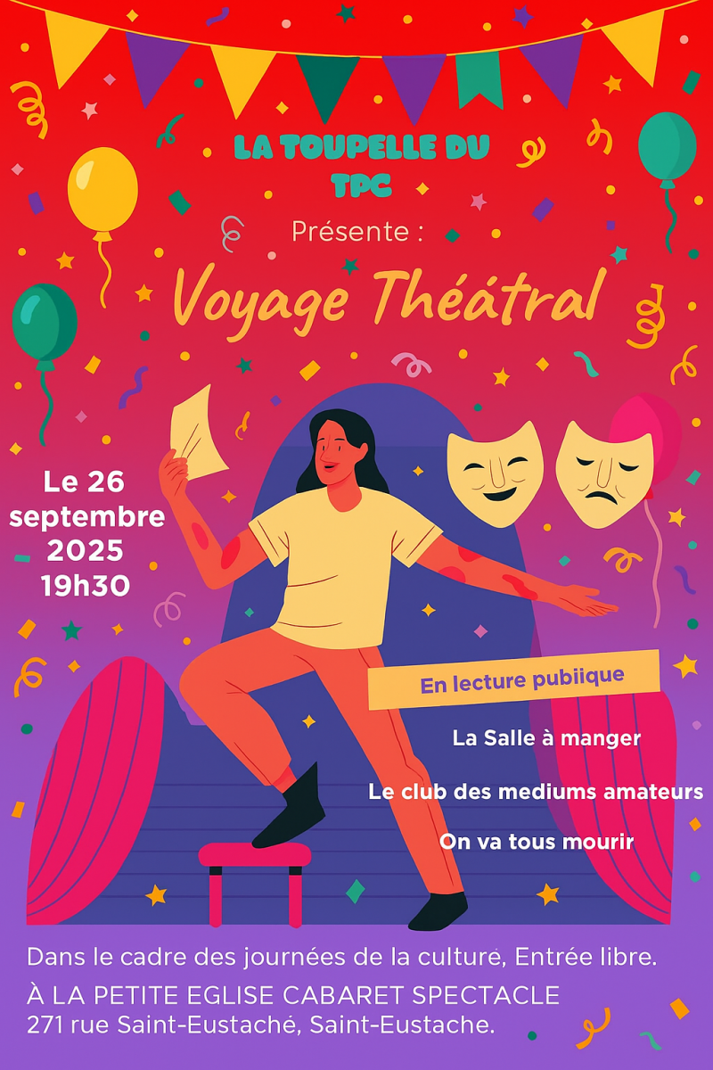Découvrez une troupe de théâtre amateur passionnée et engagée à Saint-Eustache, Québec, Canada. Nous vous offrons des spectacles inoubliables et des événements théâtraux uniques.